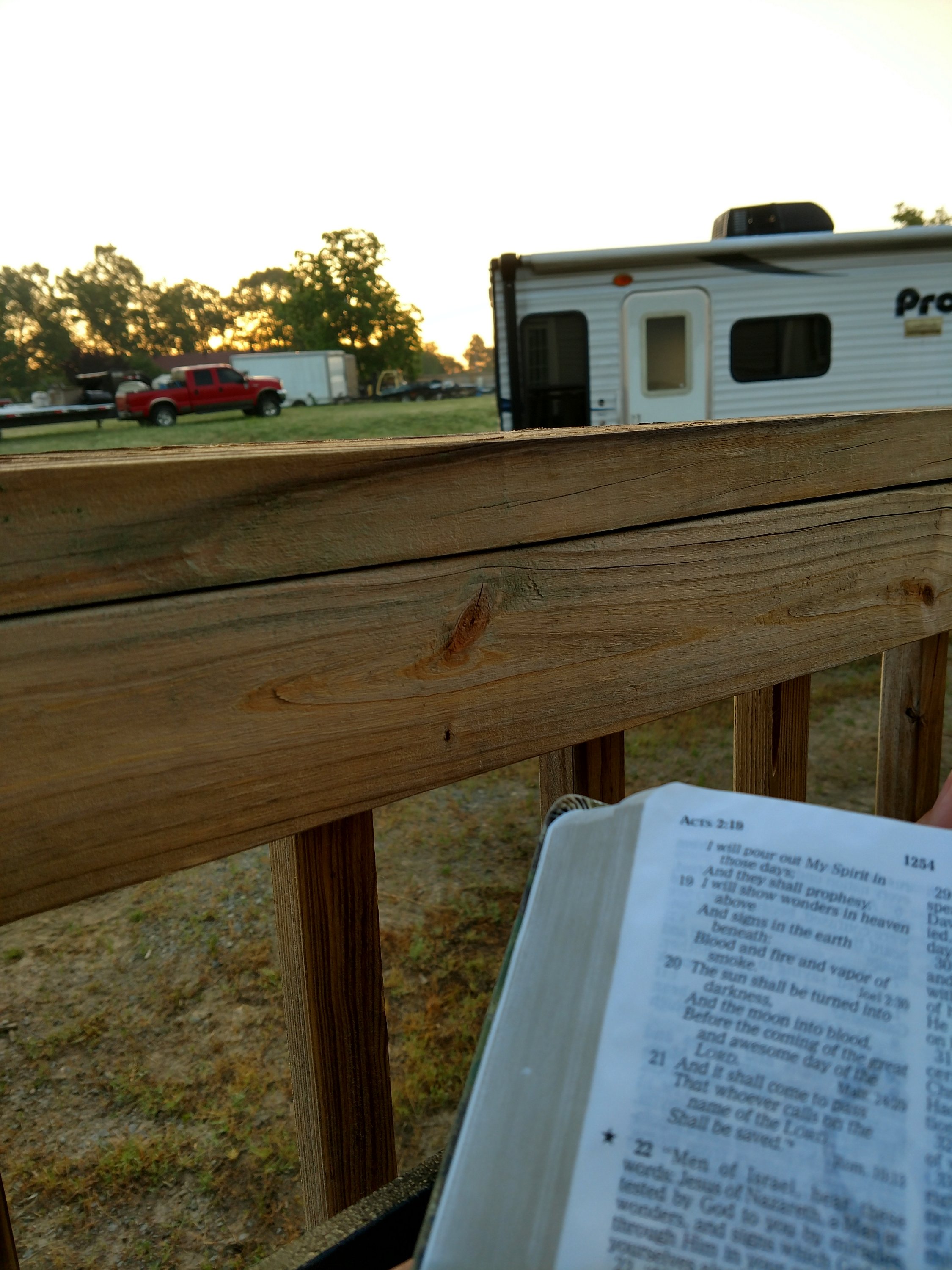 As I sit here on my back deck, coffee in hand, studying the book of Acts, I noticed out of the corner of my eye, the sunrise peeking over the treeline. I looked up to admire it but my sight was immediately blocked by my lovely view of the camper we have parked in the yard! I thought, “Well, that’s a bummer. I can’t post a picture of that!” So I turned back around and began reading again. That’s when I realized, you know what? This is MY reality. No, this view may not be some picture perfect, blog worthy fairytale view, but it’s mine and the sunrise is still beautiful! So I took the picture anyway. (The picture doesn’t do any justice, but you get the idea.)