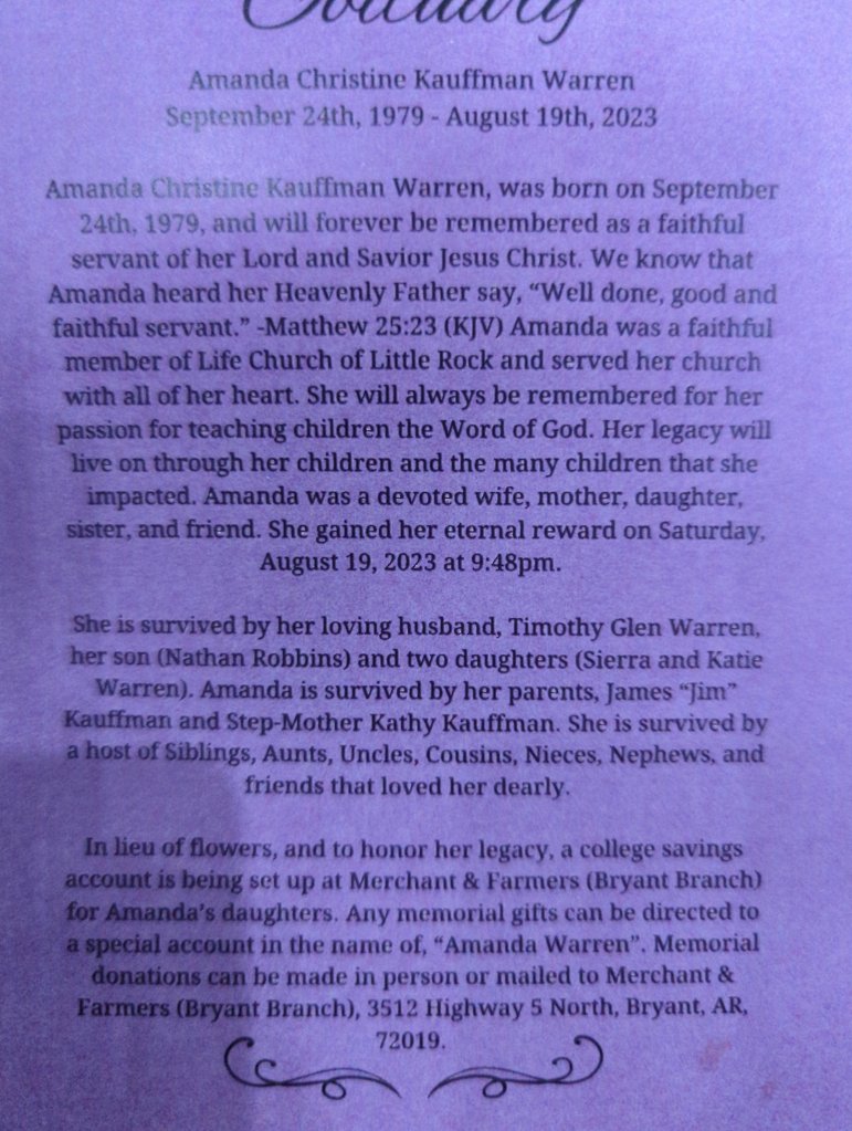Thank you for reading and for sharing in this precious time of remembrance for Mrs. Amanda Warren. I pray that you are encouraged today and that you have joy in your hearts as you think of your own “Amanda”. If she’s still with you, give her a big hug today and make sure she knows how loved and cherished she is. Don’t wait.